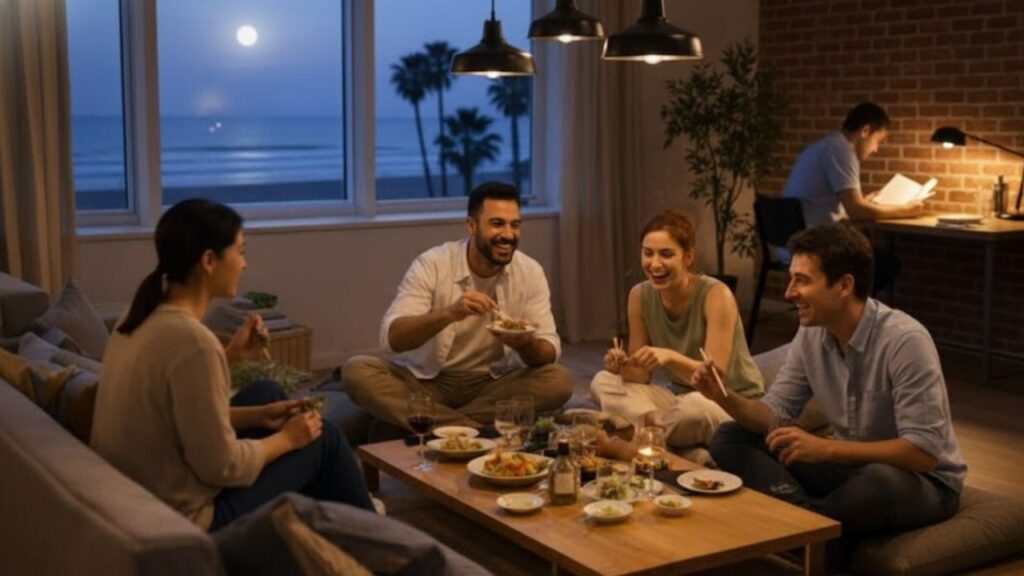 The last time I shared dinner at my friend Lea’s apartment, I spent several minutes scanning the room for the dining table. I noticed a sofa, a low modular coffee table on wheels, shelves overflowing with books, and even a hanging swing chair tucked into one corner. What I didn’t see was a large wooden table paired with matching chairs. Yet within moments, everyone was eating together. Plates were balanced on poufs, shelves, and a rolling table that expanded to double its size. The atmosphere felt relaxed, a little chaotic, and unexpectedly freeing.